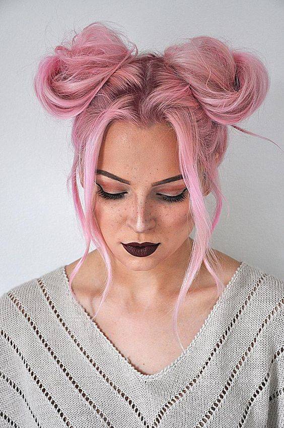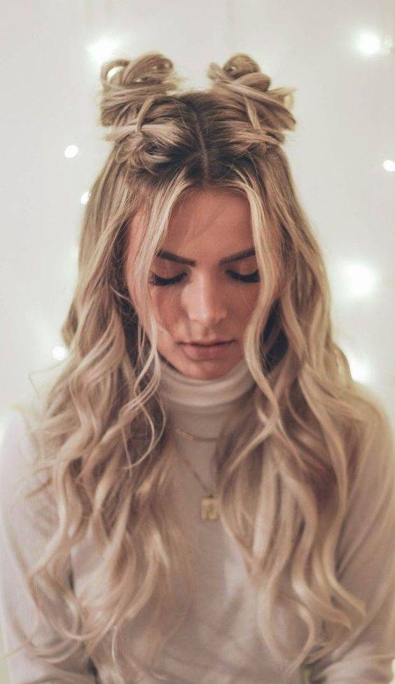 Пучки могут быть украшены бантами, которые можно расположить сзади или спереди, а также можете украсить их дополнительно сплетенными косами, спадающими прядями, как на фото ниже или заколками. Положение пучков также может меняться – их можно расположить на затылке, рядом с пробором или по бокам.