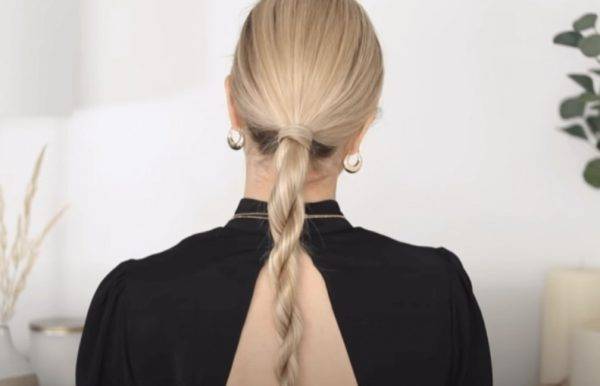 - Отделите небольшую прядь от хвоста и оберните ею резинку, чтобы скрыть ее. Аккуратно просуньте кончик пряди под ту же резинку.