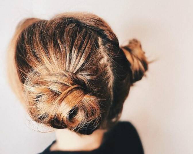 - Разделите оставшуюся от хвоста прядь на две части, перекрути их, чтобы придать объём, и оберни их вокруг основания пучка. Закрепи конец невидимкой;