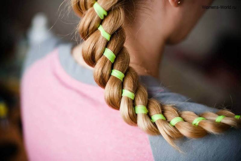 Коса с ленточками в количестве 2–3 штук выглядит ярко. Вариант используют для дополнения ансамбля одежды, привлечения внимания. Популярно использование линий материи в цветах полосатого флага.