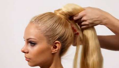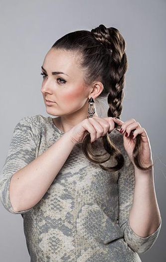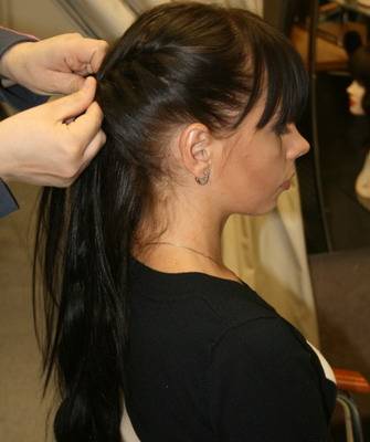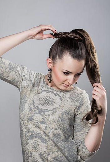 Теперь берем шиньон-хвост, крепим к родному хвосту и фиксируем ленту в нижней его части. Распределим равномерно накладные прядки. Тонкие косички обматываем вокруг пышного хвоста, чтобы скрыть ленту крепления и фиксируем снизу невидимками.
