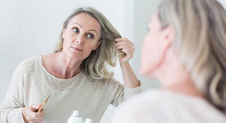 Во время менопаузы гормональный фон женщин значительно изменяется. Кто-то жалуется на усиленный рост, а кто-то, наоборот, страдает от выпадения волос. Основная причина выпадения волос в период менопаузы — изменение гормонального фона. Содержание эстрогена и прогестерона в крови снижается, а действие андрогенов и мужских стероидов усиливается. Это становится причиной андрогенной алопеции.
