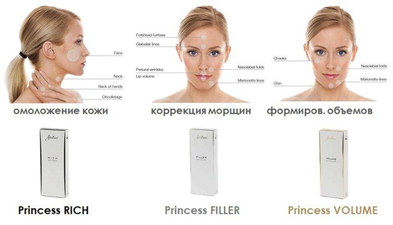 Линейка «Принцесс» включает 4 препарата, которые отличаются концентрацией гиалуроновой кислоты, плотностью, а значит и показаниями к применению.