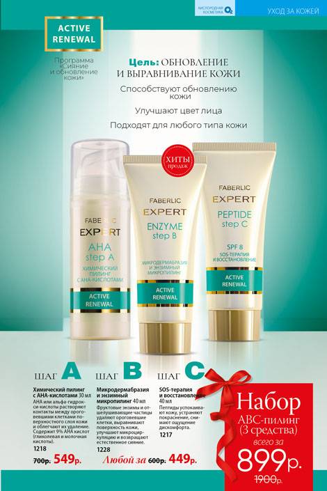 Компания Фаберлик уже давно известна в мировой индустрии красоты. Согласно мнениям множества довольных девушек, программа АВС-пилинга действительно эффективна, и позволяет ухаживать за кожей лица даже в домашних условиях. К тому же подобрать необходимую продукцию может женщина любого возраста.