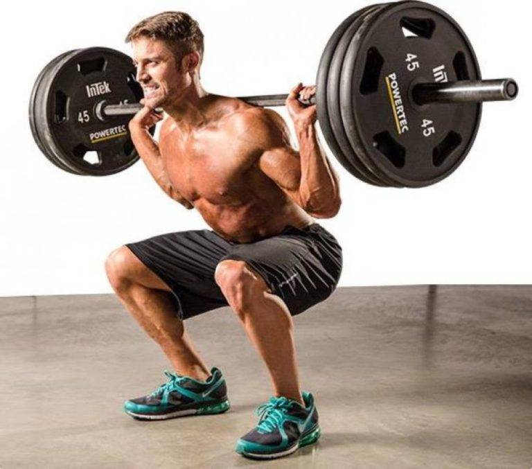 - Присед с грифом (10-9-8-7 повторов с 1-го по 4-й подходы соответственно)
