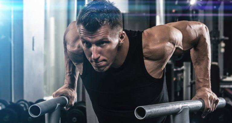 - Отжимания на брусьях (как разминочное упражнение для грудных и трицепса) – 3 подхода по 10 повторов