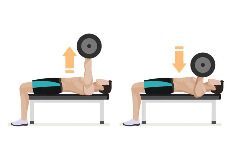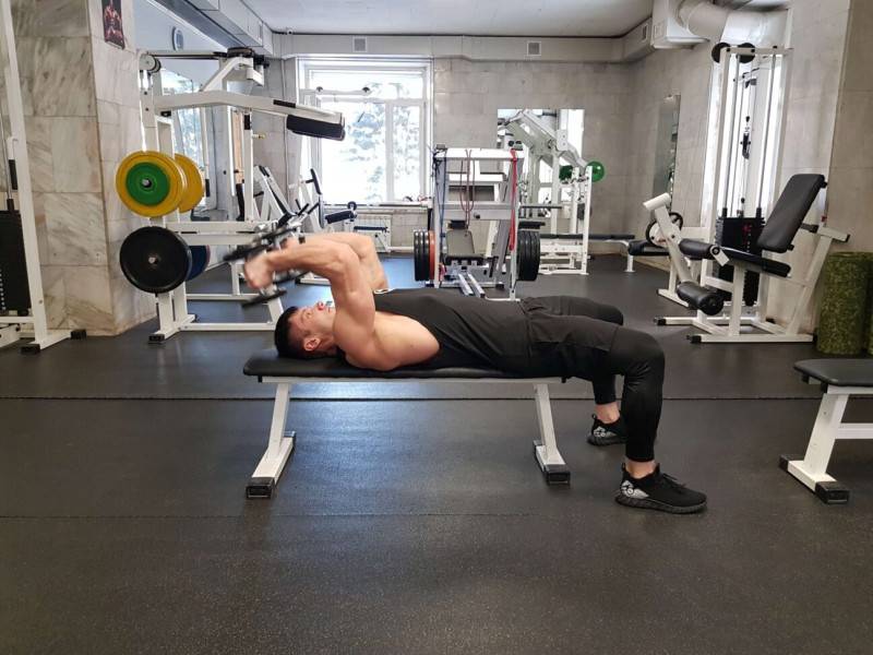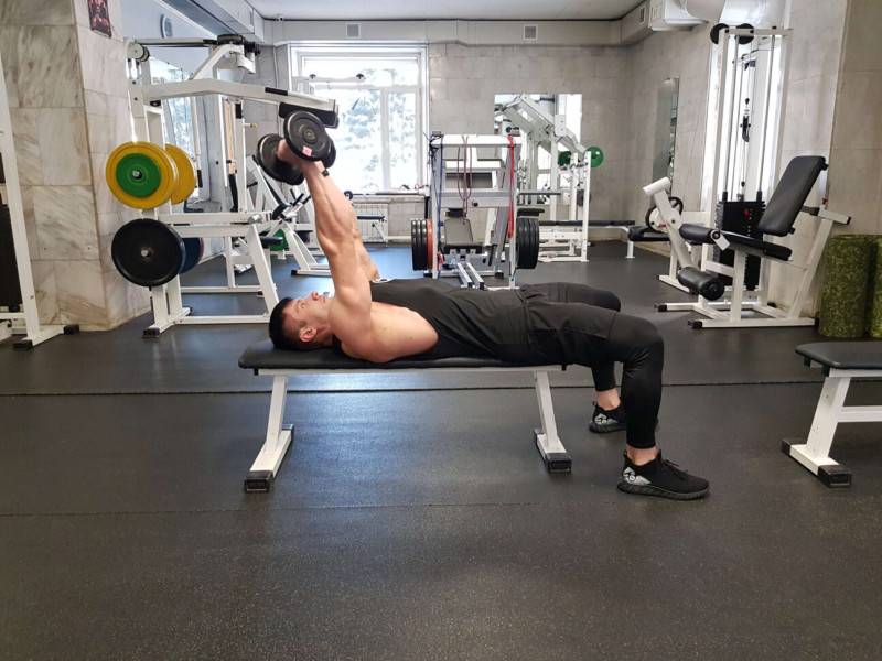 - Лечь на скамью. Поднять гантели на уровень глаз. Зафиксировать локти в этом положении.