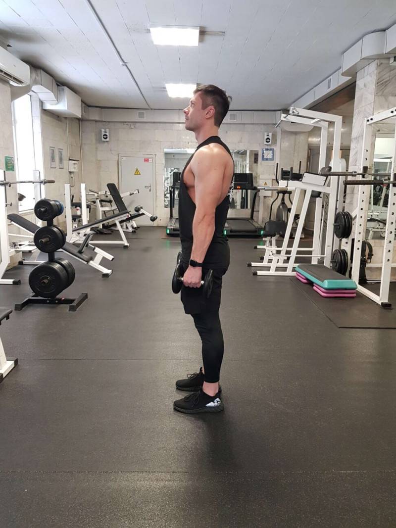 - На выдохе согнуть локти и привести гантели к плечам. Не отрывать локти от корпуса.