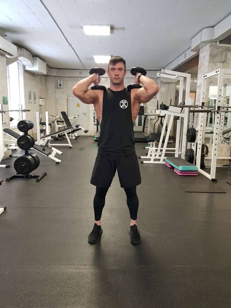 - Жимы гантелей в положении стоя — 2 подхода по 12 повторов в каждом.