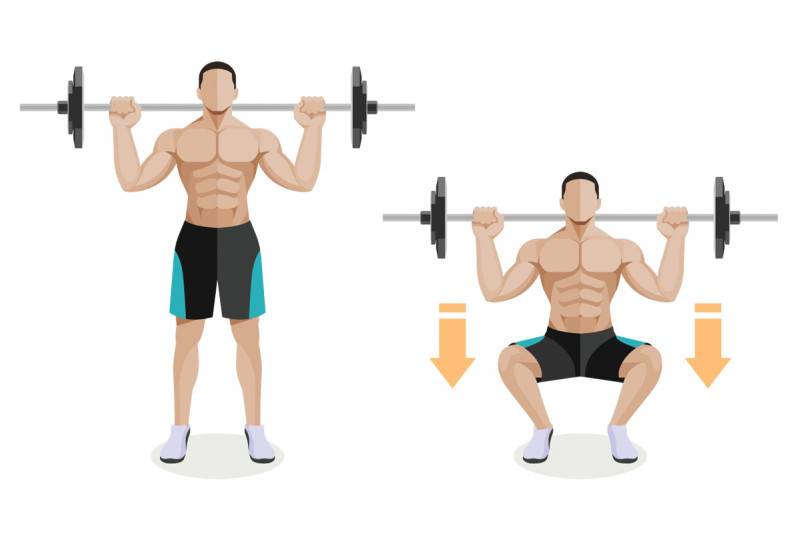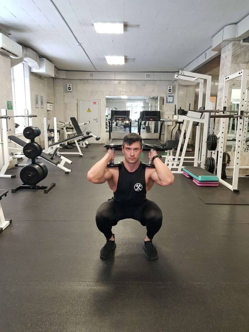 - Встать ровно, ноги расставить на ширине плеч. Гантели поставить на плечи.