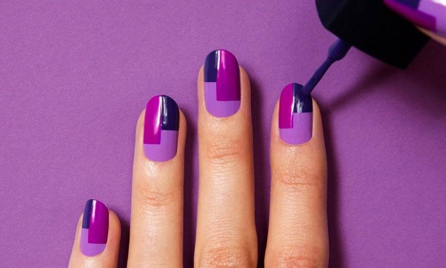 Ультрамодную в этом году геометрию можно повторить самостоятельно. Для этого нам, опять же, понадобится скотч. Разделяя разные зоны ногтя друг от друга, можно добиться чётких линий и геометрических форм. Полёт для фантазии бесконечен.