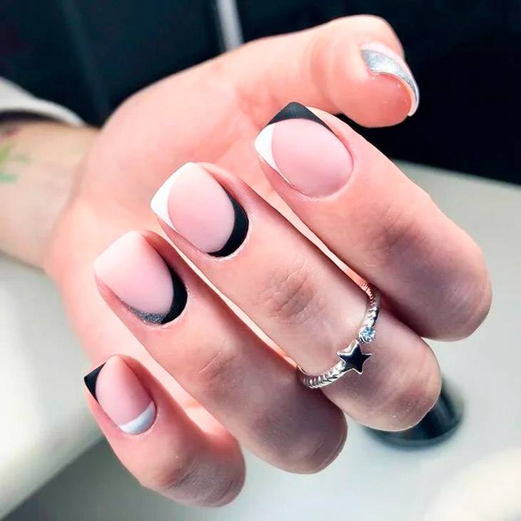Говоря о сочетании цветов, нельзя не упомянуть о черно-синем маникюре. Этот вариант всегда смотрится по-особенному стильно.