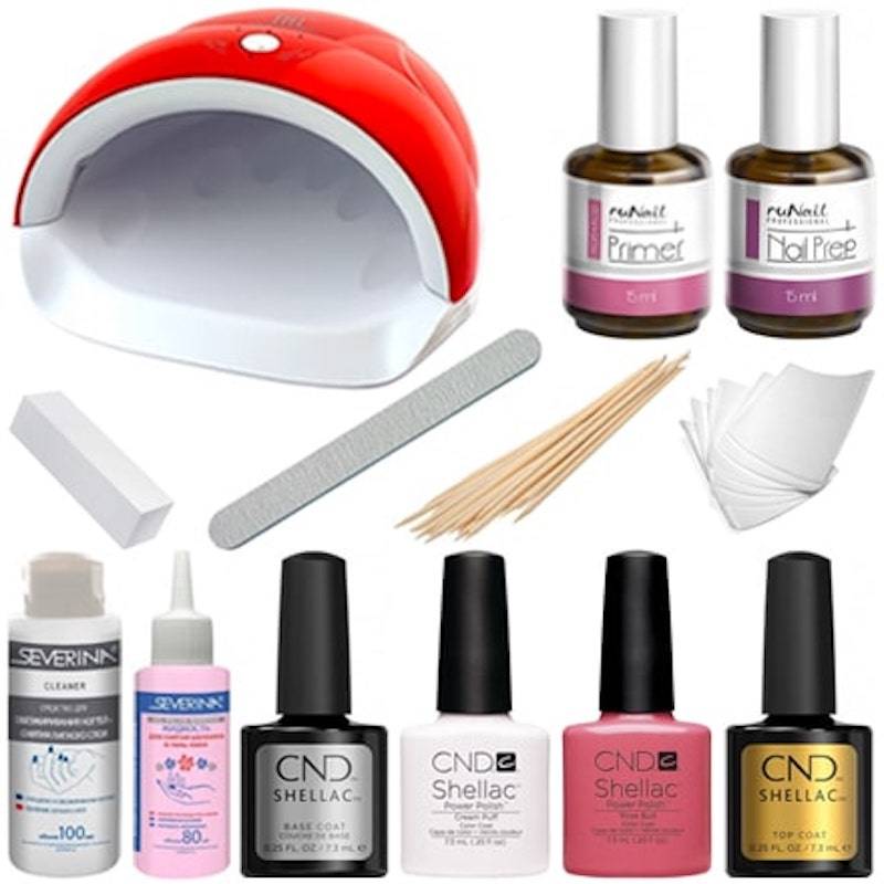 - Шеллак и приспособления для дизайна – кисточки, наклейки, стразы, штампы и др.;