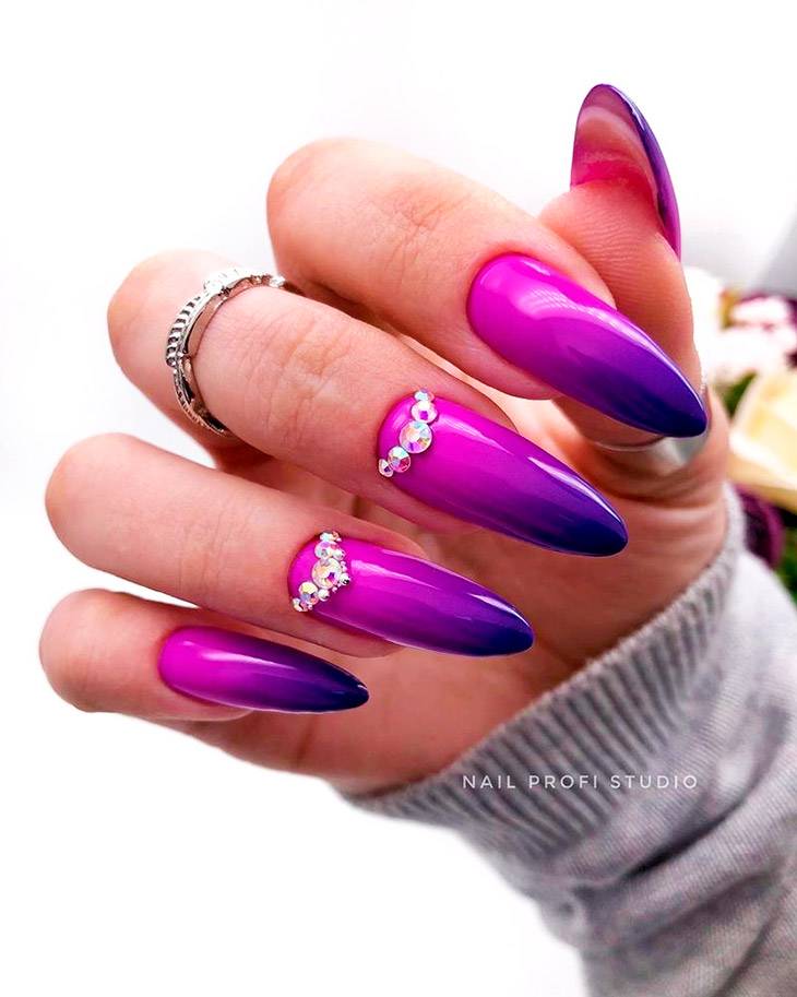 Этот эффект можно сравнить с омбре – плавным переходом одного цвета лака в другой. Омбре подразумевает осветление кончика ногтя на несколько тонов, при этом основной окрас пластины должен быть в гармоничной гамме. Еще одно название градиента Dip Dye – при таком дизайне комбинируется несколько разных оттенков лака, между которыми на ногте создается переход. Обычно для качественного градиента используется 5 оттенков лака.