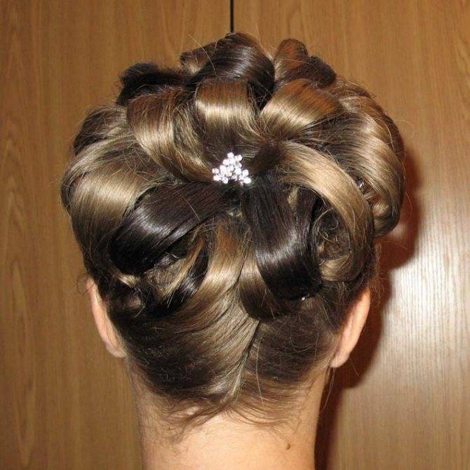 Стильная укладка в виде цветка дополнит любой праздничный лук. Для нее потребуется бублик для пучка, на который накручивают большое количество маленьких жгутов из конского хвоста. Перед созданием прически нужно разогреть в руках немного воска.