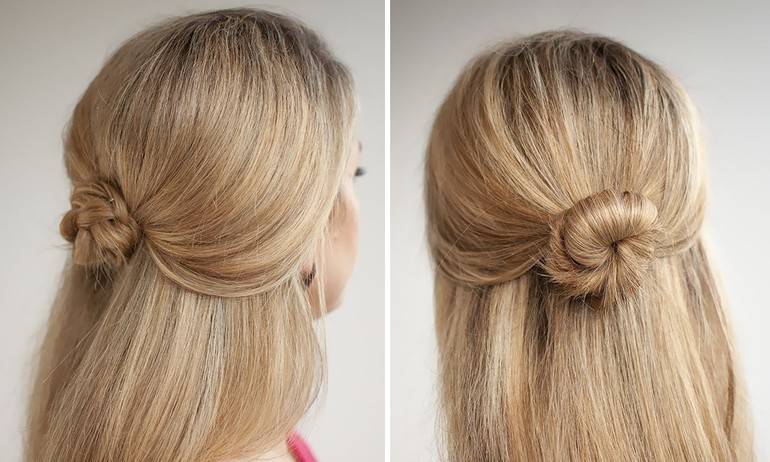 Крупная роза из волос станет стильной и легкой укладкой для повседневного образа. На волосы наносят немного мусса. Делают два хвоста на затылке и накладывают их друг на друга, завязывая простой узел. Получившиеся прядки скручивают жгутом и переплетают по часовой стрелке, создавая изящный цветок.