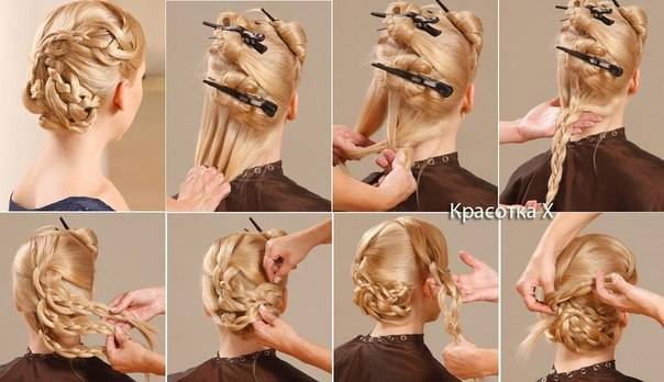 Поэтапная схема плетения прически представлена на фото ниже.