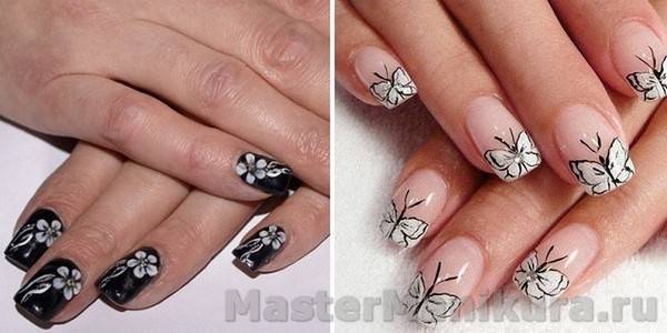 «Классикой жанра» принято считать черно-белые рисунки на ногтях, которые подойдут к любому образу и по любому случаю. Причем, вовсе не обязательно использовать их вместе, вполне можете ограничиться только черным котом или белым цветочком. Хотя, сочетание основного цвета с прорисовкой (например, белые глазки в первом случае и черные тычинки во втором) будет смотреться гораздо эффектнее.
