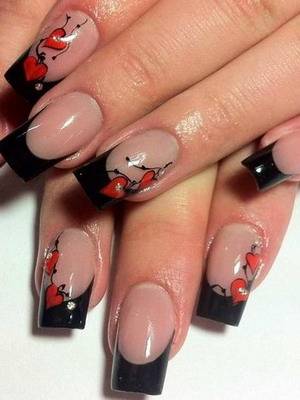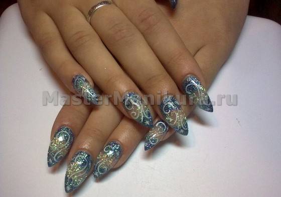 Очень изысканно будет смотреться рисунок, если оставить на нем свободные места, а всю ногтевую пластину покрыть бесцветным лаком. Для создания нарядного маникюра рисунок можно украсить блестками или рисунками из цветного песка.