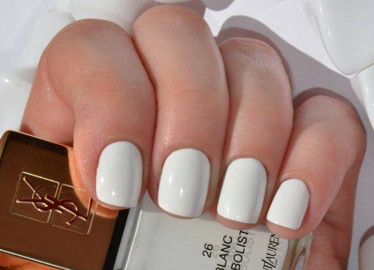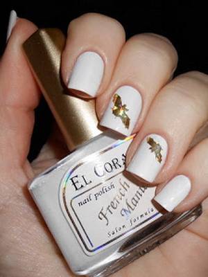- Нанести базу, высушить. Затем окрасить ноготь выбранным оттенком лака в два слоя. В нашем случае это ярко-белый цвет, на нем выбранный рисунок будет смотреться наиболее эффектно. Не стоит заморачиваться над тем, чтобы лак лег ровно без проплешин. После нанесения картинка скроет все недостатки. Слой лака должен хорошо высохнуть. Дождитесь естественного высыхания или используйте специальный состав для быстрой сушки.