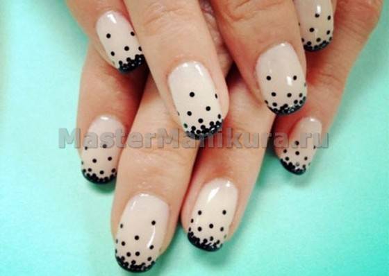 Для того чтобы отвлечь внимание окружающих от некоторых неровностей и прослыть оригинальной особой, можно разбавить белую полоску точками, нанесенными разноцветным лаком. Или сделать обратный френч, на котором точки будут разбросаны по всей ногтевой пластине
