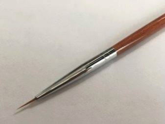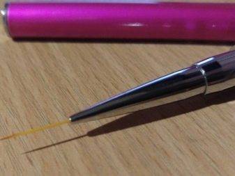 Ворс инструмента собран на кончике в остроконечную пику. Во время работы кисть держат вертикально и обмакивают в лак только самый кончик. Первоначально ею ставят точку, а потом из нее вытягивают узор. Инструмент понадобится для воспроизведения мелких элементов, цветов и кружев. - «Волосок».