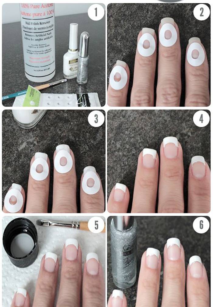 - Прокрасьте верхнюю часть ногтевой пластины, которую вы уже отграничили полоской, белым лаком (это в классическом варианте, вы же можете использовать любой цвет).