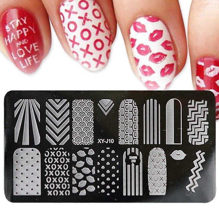 - Стемпинговая печать. С помощью резиновой печати и прилагающихся к ней в комплекте переводных цветных и черно-белых узоров можно быстро и легко выполнять всевозможные рисунки на ногтях для начинающих.