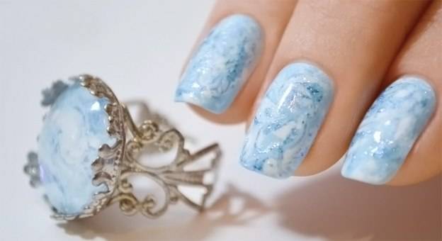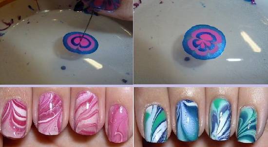 Чтобы создать оригинальный водный нейл-арт, вам понадобится стакан холодной воды. В него аккуратно по капельке следует добавить различные оттенки лаков. Затем нужно смешать их зубочисткой и направить в самый центр стакана. Теперь поочередно опускайте ноготки так, чтобы лак покрыл их поверхность. Лаковое покрытие пристанет в неповторимом замысловатом узоре. Чтобы после процедуры кожа осталась чистой, ее предварительно нужно смазать любым растительным маслом.