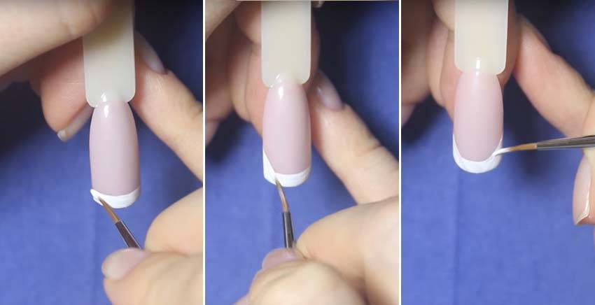 - Прокрасьте верхнюю часть ногтевой пластины, которую вы уже отграничили полоской, белым лаком (это в классическом варианте, вы же можете использовать любой цвет).