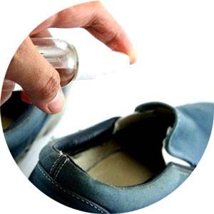 - Содержимое флакона нужно распылить так, чтобы раствор попал во все уголки ботинок, особенно нуждается в обработке область носка.
