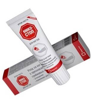 Микостоп крем-паста. Содержимое тюбика необходимо нанести на пораженную область кожи или ногтя грубым шаром.