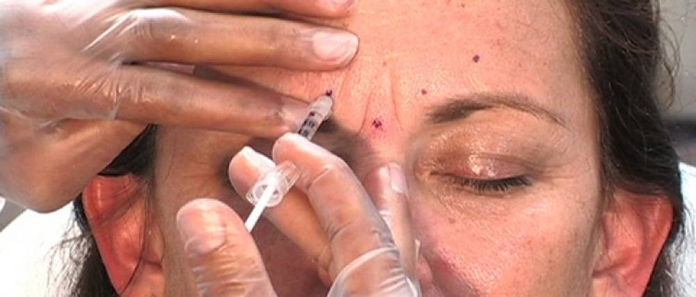 При коррекции лба уколы делают над бровями и по центру, иногда в несколько линий, в точки, расположенные на 1,5 сантиметра дальше от центра. На лоб идёт от 6 до 8 инъекций. Сначала прорабатывается центральная зона. Врач захватывает кожу посередине лба. В результате чего получается тонкая складка. В неё до упора вводится игла. Прокалывание происходит буквально до кости.