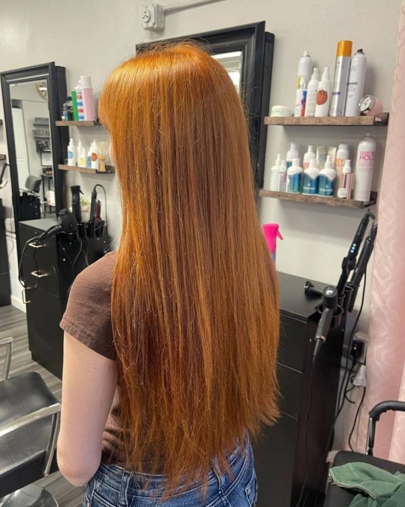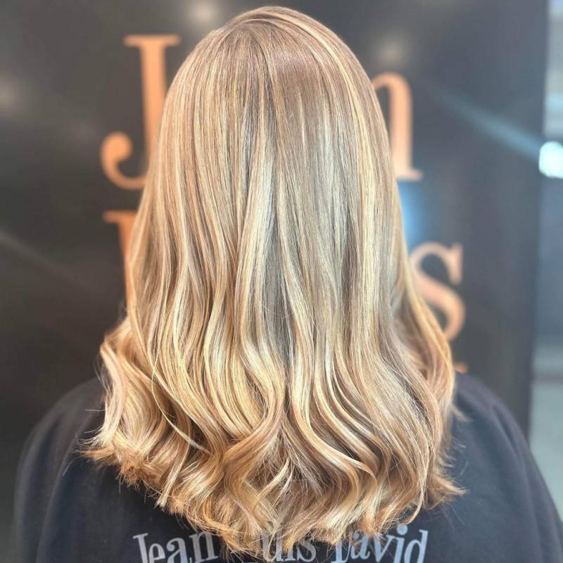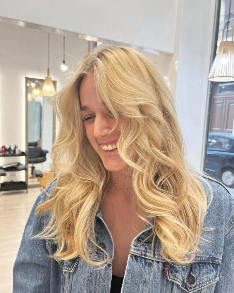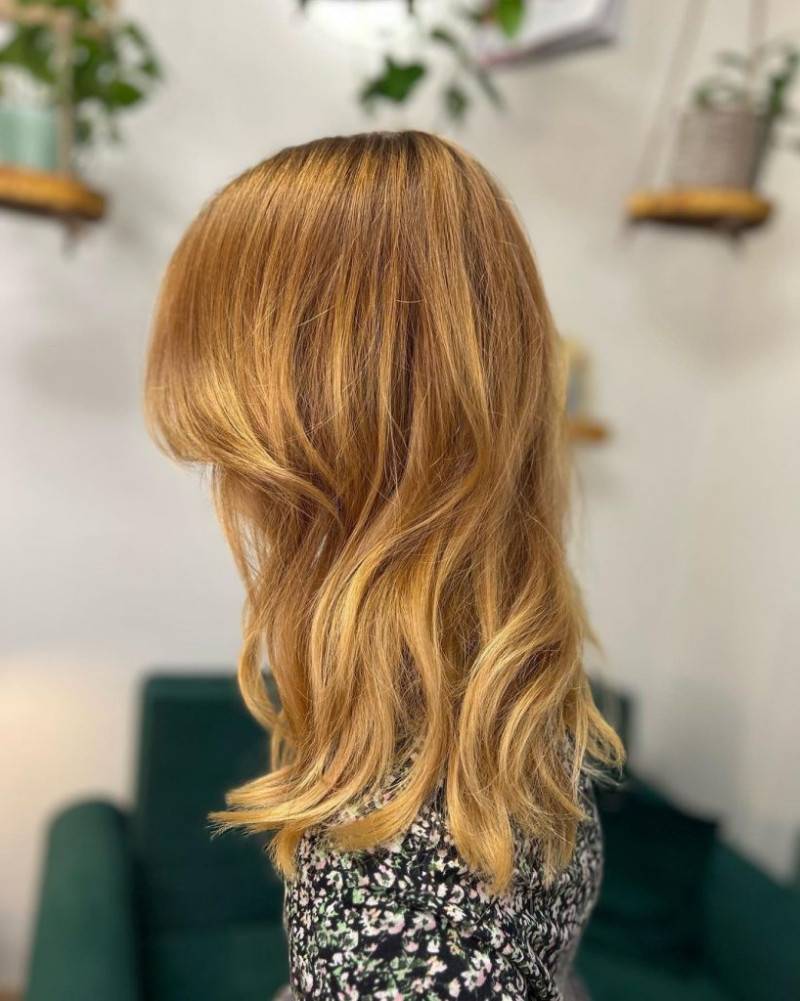 Этот оттенок волос ярко отражает свет, словно каждая прядь обладает внутренним сиянием. Золотисто-пшеничный цвет волос привлекает взгляды своей естественной яркостью и свежестью, создавая образ, наполненный энергией и радостью.