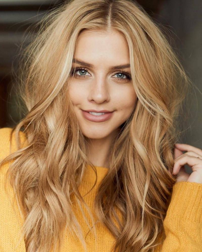 Сочетание золота и карамели делает прическу восхитительной. Золотисто-карамельная расцветка подобна пшенице, но из-за золотых бликов выглядит ярче. Она подойдет натуральным блондинкам, которые желают немного изменить облик. Еще она идеален для зеленых глаз.