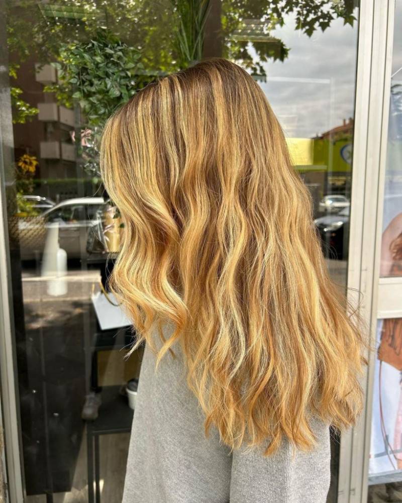 Балаяж — способ окрашивания верхнего слоя отдельных тонких прядей. Специалист делает быстрые штрихи по волосам самим кончиком щетки. Использование нескольких тонов создает максимально естественный эффект. Какой цвет волос подходит весеннему цветотипу? Данная метод подразумевает солнечные медовые оттенки и смотрится очень красиво как на белокурых, так и на более темных локонах.
