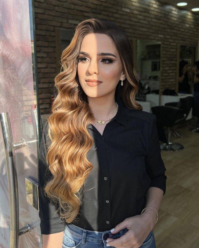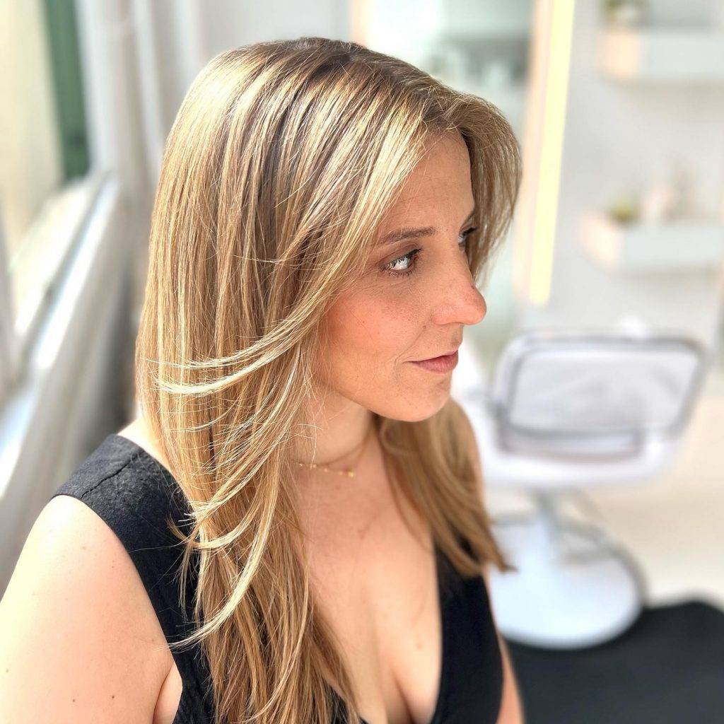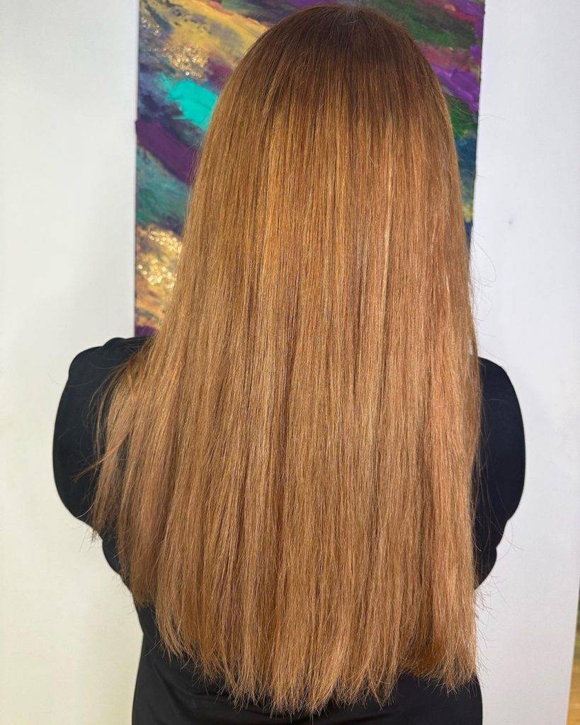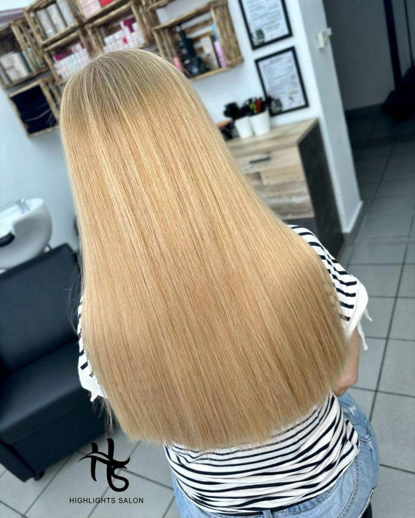 Этот оттенок волос ярко отражает свет, словно каждая прядь обладает внутренним сиянием. Золотисто-пшеничный цвет волос привлекает взгляды своей естественной яркостью и свежестью, создавая образ, наполненный энергией и радостью.