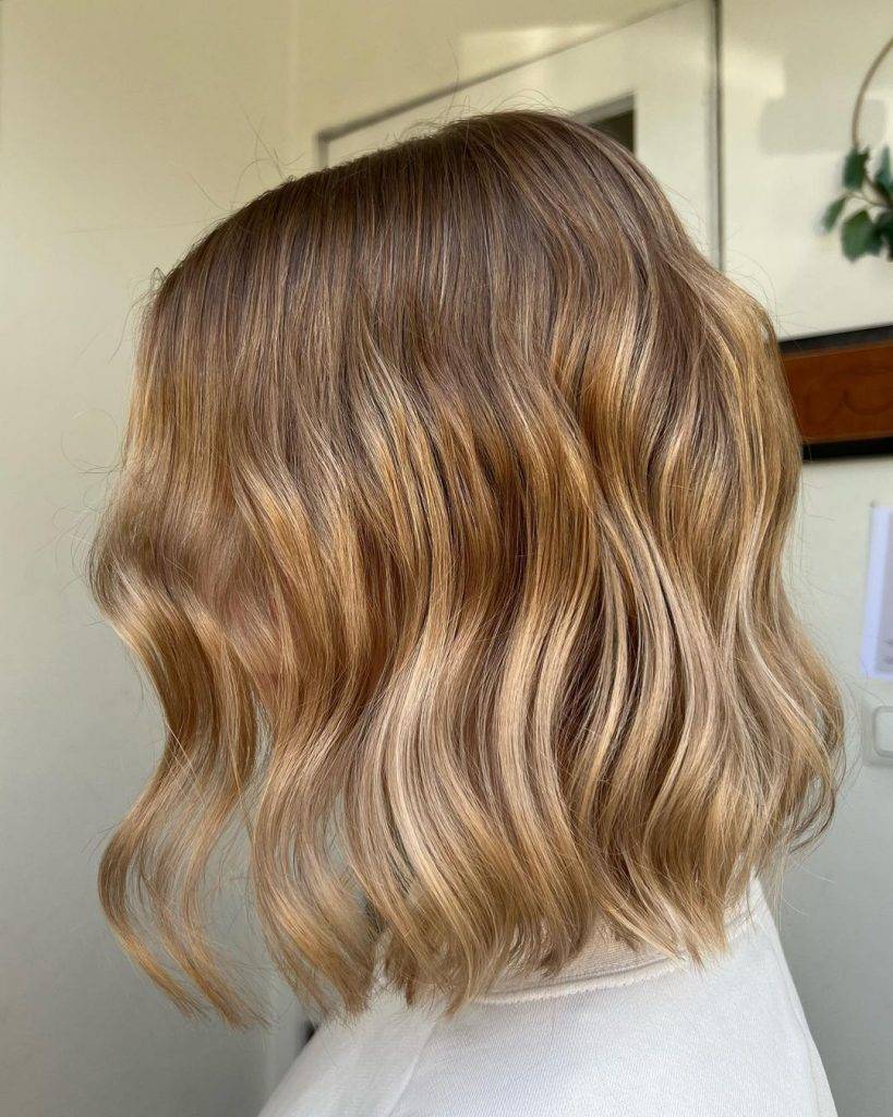 Сочетание золота и карамели делает прическу восхитительной. Золотисто-карамельная расцветка подобна пшенице, но из-за золотых бликов выглядит ярче. Она подойдет натуральным блондинкам, которые желают немного изменить облик. Еще она идеален для зеленых глаз.