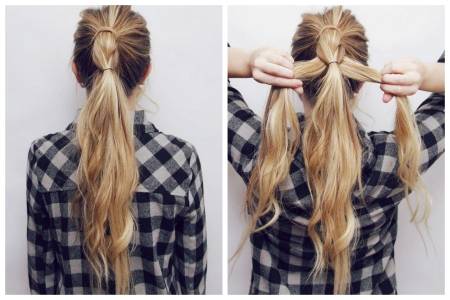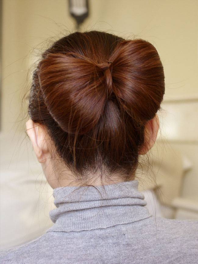 Конечно, если вы работаете в офисе, такая прическа там может быть не очень уместной, но в других случаях она будет выглядеть очень эффектно и необычно. Итак, сначала аккуратно расчешите волосы, чтобы они стали гладкими и соберите локон в хвост, там, где планируете сделать бант (например, на макушке). Делая пучок, оставьте петлю из волос, не до конца их вытягивая. К слову, оставленный кончик хвоста (он не должен быть очень коротким) следует перекинуть ближе к лицу, на переднюю сторону головы. Теперь разделите петлю на две части, которые будут представлять собой половинки банта. Теперь через эти две части перекидывайте конец хвоста в виде перепонки для банта. Кончик этой перепонки спрячьте под бант, предварительно зафиксировав его шпилькой.