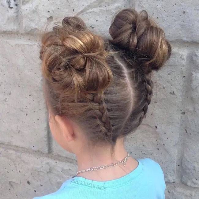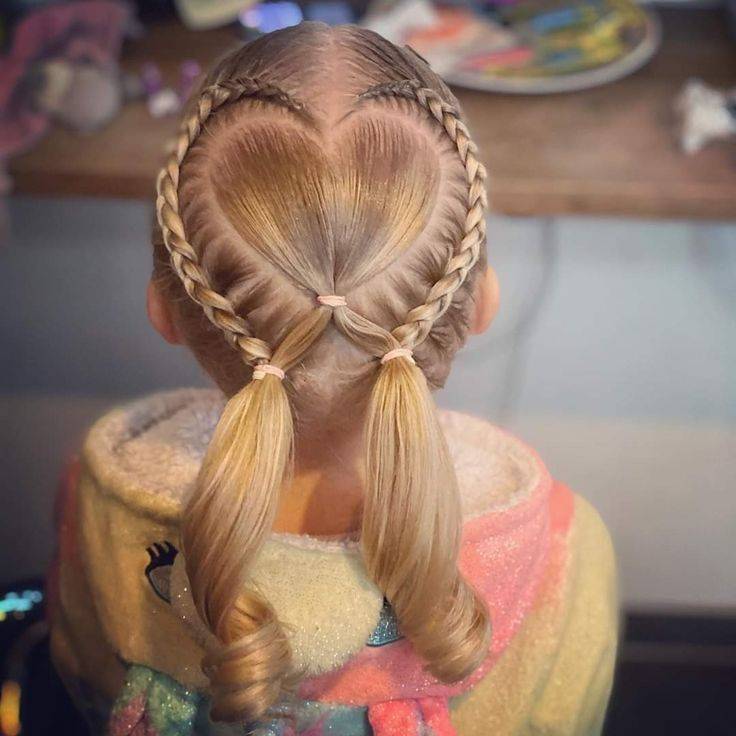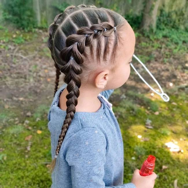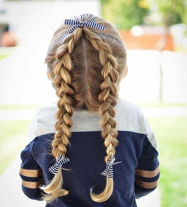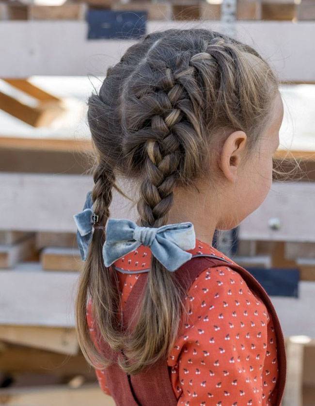 Если вы ищете аккуратную и компактную прическу для своего ребенка, это было бы отличным выбором. Это две боковые французские косы. Идеально, если вы не хотите, чтобы волосы не мешали вашему ребенку в ее активный день. Они держат форму и легко остаются на месте.