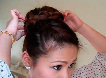 - 2. Начиная с задней косички, начинайте плести пучок. Для этого просто скрутите одну косу вокруг своего основания. Кончики косы можно спрятать в центр пучка. Результат необходимо закрепить шпильками.