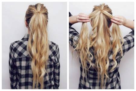 Если вы хотите сделать более пышными длинные волосы, этот трюк идеален. Просто разделите волосы на затылке горизонтально, получив верхний и нижний слой. Обе части завяжите в хвост тонкой резинкой. Обе части будут располагаться друг на друга, получится небрежный конский хвост, который будет выглядеть в два раза длиннее и пышнее.