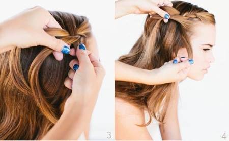 - Шаг 4а-4б. На основе выделенных волос заплетите французскую косу: отделите прядку, разделите ее на 3 части и заплетите косу, каждый раз захватывая с прядями все новые пучки волос.