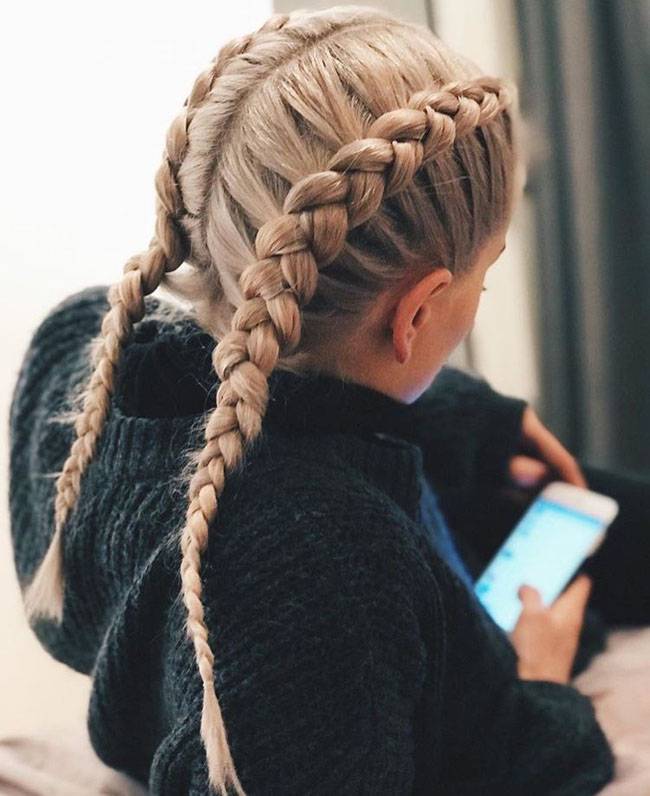 Боксерские косы идеальны для женщин предпочитающих спортивный стиль. Но и с женственным платьем или юбкой они тоже будут выглядеть стильно. Заплетите косы, с прямым пробором, зафиксируйте тонкой резинкой-невидимкой кончик, и на весь день вам гарантирован идеальный вид.