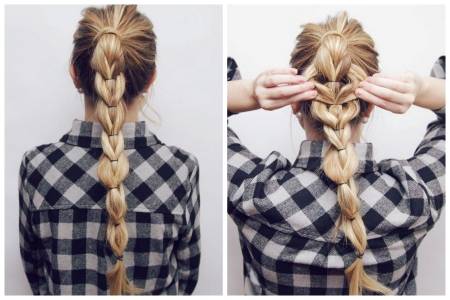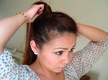 Разделите хвост на 3 части, и 2-мя боковыми частями хвоста перекройте сверху его центральную часть и закрепите две верхние пряди резинкой.