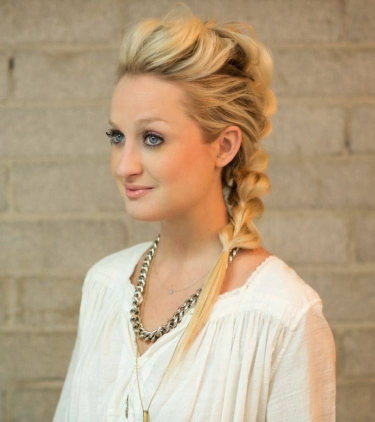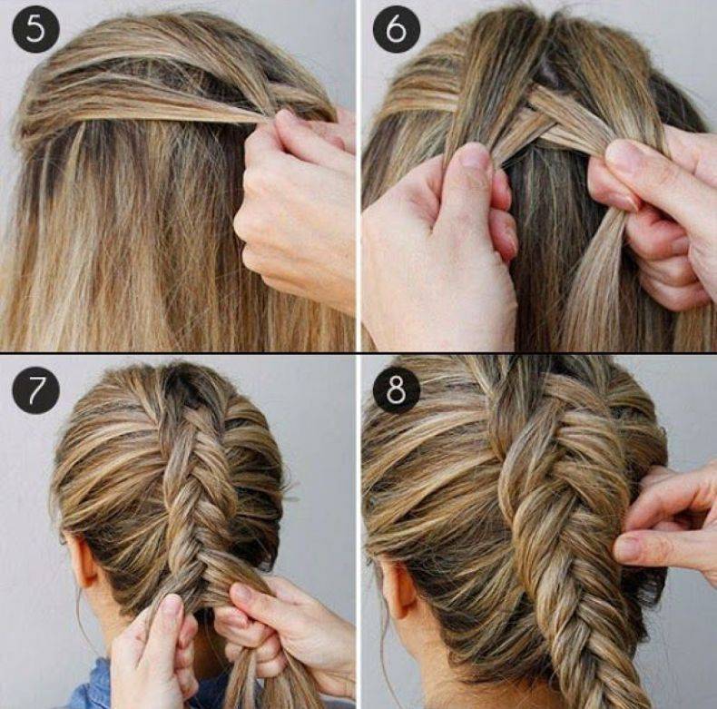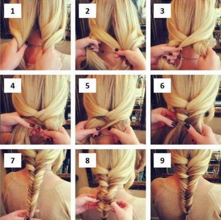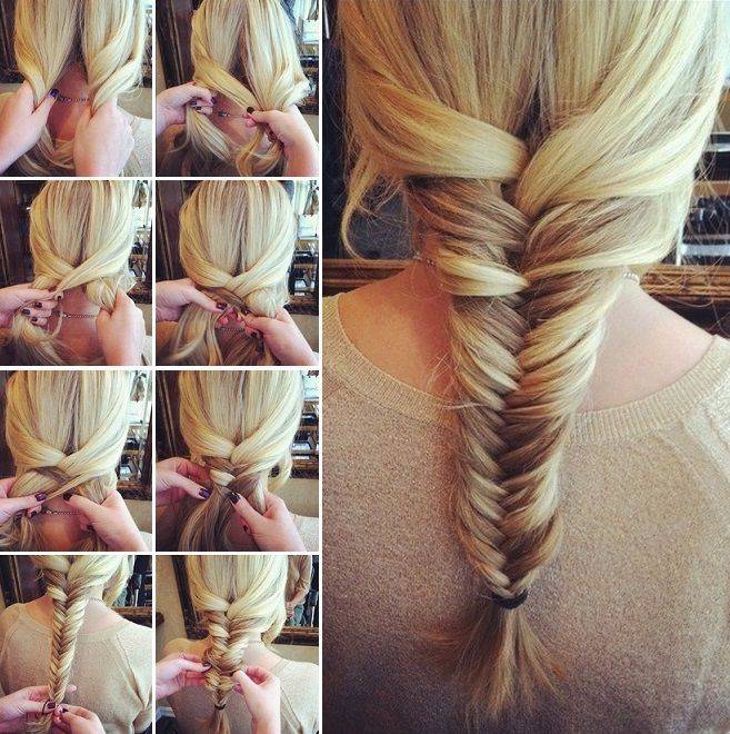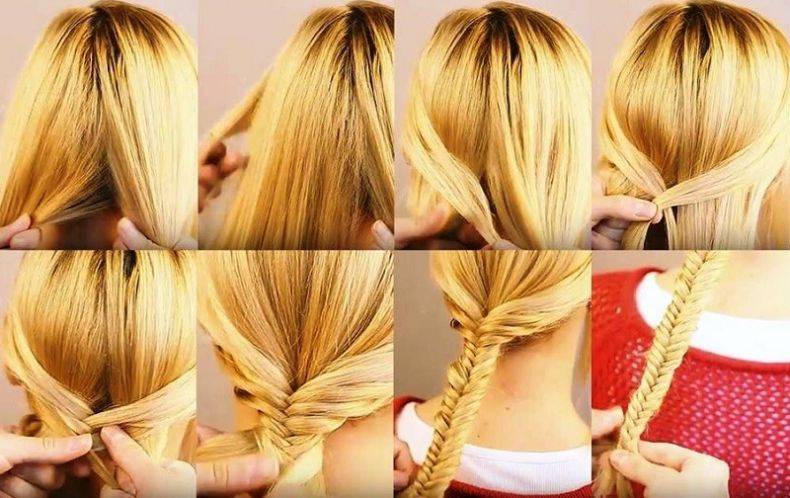 Прическа на каждый день. Приступим к плетению французской косы рыбий хвост. Пока вы не дойдете до конца, давайте закончим собирать пряди волос и заплести еще немного косы. В конце закрепляем резинкой.