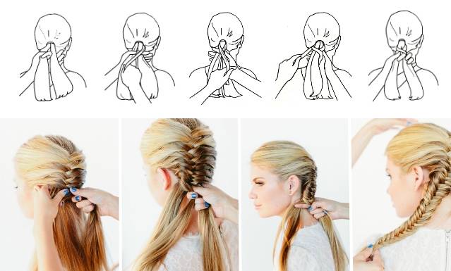 - Далее с правой части волос берется прядь и ложится на левую сторону пряди, захватывая ее правой рукой. Прядь должна проходить под хвостом.