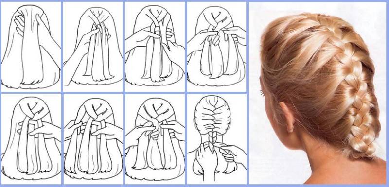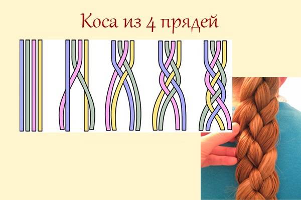 - первая прядь заводится под вторую, продевается снизу вверх над третьей и вновь заводится вниз под четвертую, становясь при этом крайней справа;