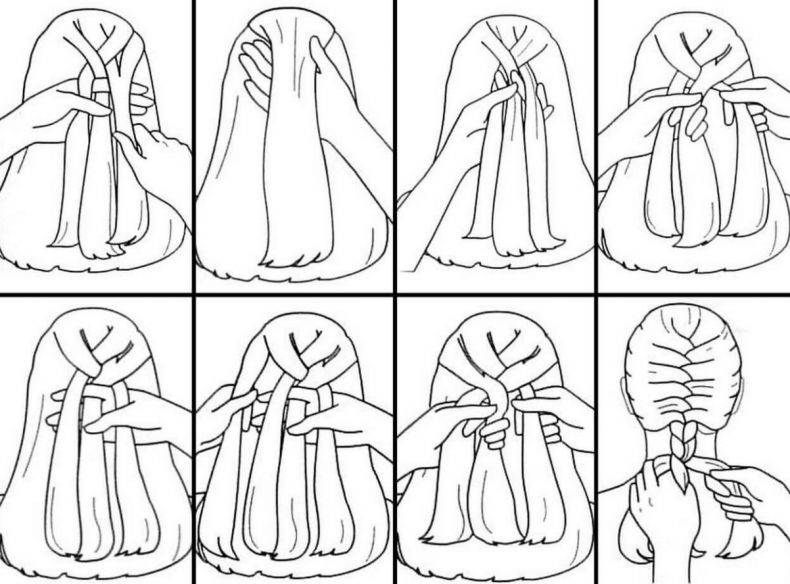 - Закрученные на 5 см пряди скрестить и перекрутить так, чтобы они остались в противоположных руках.