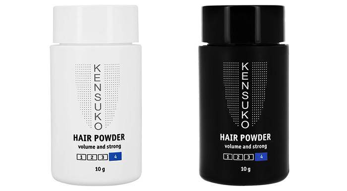 Пудра Kensuko Create равномерно распределяется и втирается в кожу головы, не смывается. Продаётся во флаконах по 10 грамм.